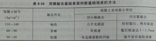 2.混凝土基礎(chǔ)的質(zhì)量檢查,可用錘敲擊的方法判斷基礎(chǔ)強(qiáng)度,判斷方法見表4-16.